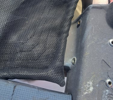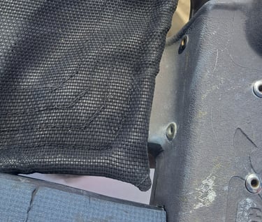 Open forward corner, mosty unobstructed, aside from the line from grommet to side beam. Here forward corner casting is at upper left and side beam is lower left.